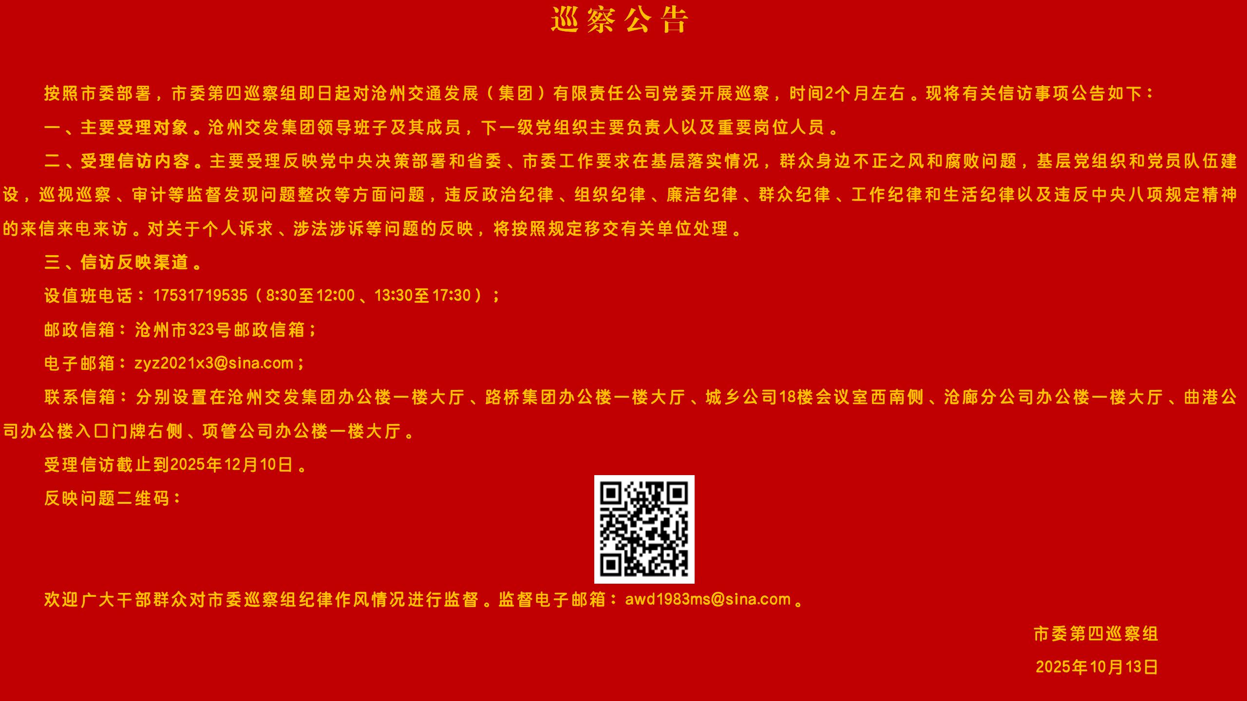 市委第四巡察組巡察 滄州交通發(fā)展(集團(tuán))有限責(zé)任公司黨委 工作動(dòng)員會(huì)召開(kāi) 2025-10-17
